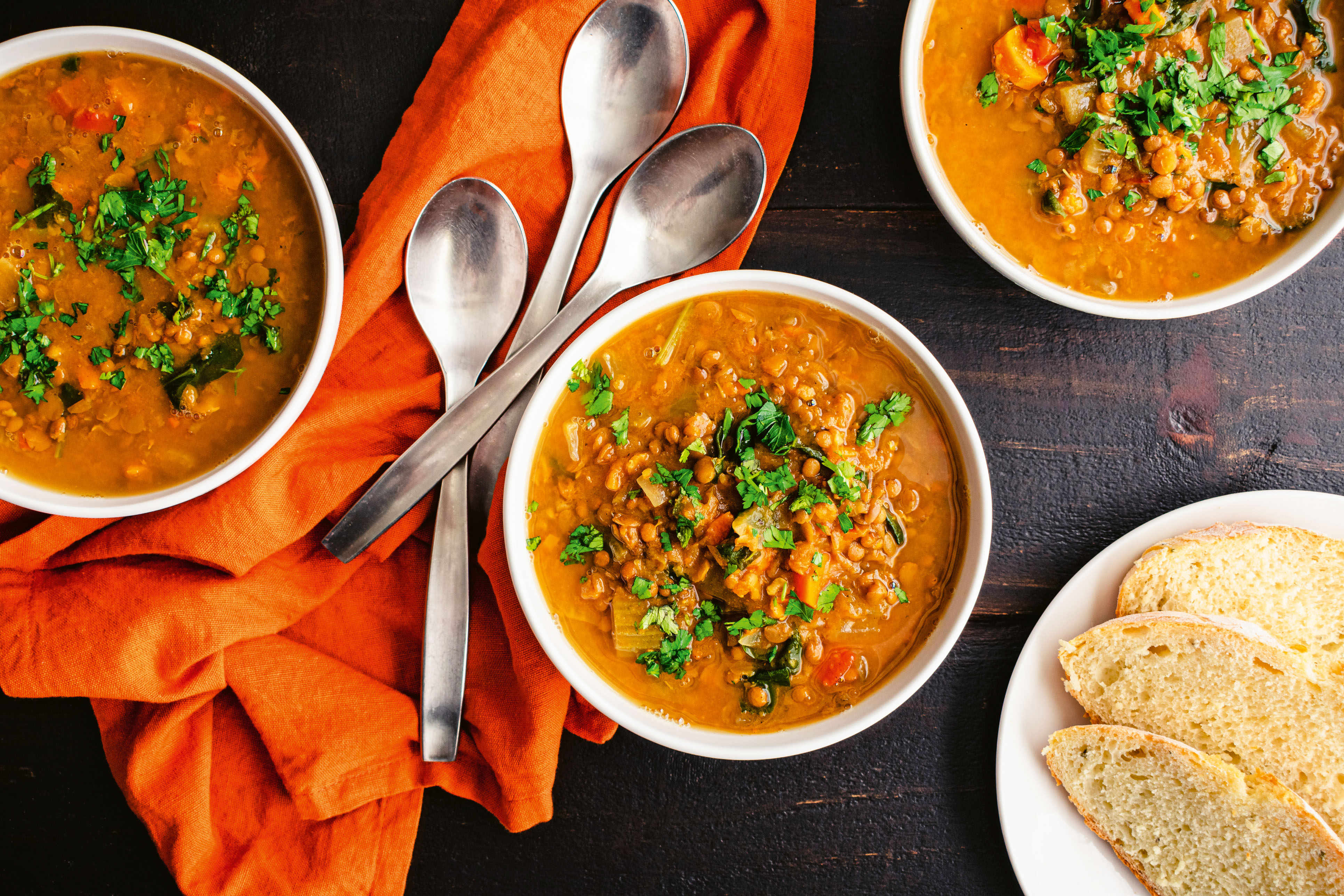 Die Zwiebeln in einer grossen Pfanne bei mittlerer Hitze im Öl anschwitzen lassen, bis sie glasig sind. Knoblauch beifügen und beides weiter andünsten, bis der Knoblauch goldgelb wird. Karotten, Bouillon, Milch und Linsen zugeben. Zum Kochen bringen und etwa 20 Minuten köcheln lassen, bis die Karotten und die Linsen weich sind. Mit Salz und Pfeffer nach Belieben abschmecken. Alles zusammen mit einem Pürierstab oder einem Mixer pürieren, bis eine glatte, cremige Flüssigkeit entsteht. In Schalen verteilen und mit etwas Petersilie dekorieren. Dieses Rezept kann mit einer kohlenhydrathaltigen Zutat (1 bis 2 Scheiben Vollkornbrot) und einer proteinhaltigen Zutat (z. B. 50 g Käse) ergänzt werden. Guten Appetit!