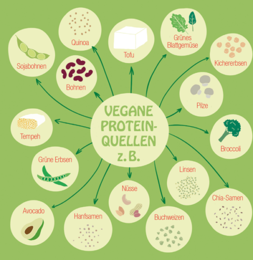 Beim Vegetarier ist die Deckung des Proteinbedarfes durch die eiweissreichen Lebensmittel wie Eier, Milch und Milchprodukte gewährleistet. Der Veganer hat deutlich weniger Auswahl. Er deckt seinen Proteinbedarf mit Tofu, Sojagranulat, Tempeh, Seitan, Lupineneiweiss, Vollkornprodukten und Hülsenfrüchten. Für beide, Vegetarier und Veganer, ist es wichtig, die biologische Wertigkeit des Eiweisses zu verbessern, indem hochwertige Lebensmittelkombinationen konsumiert werden.